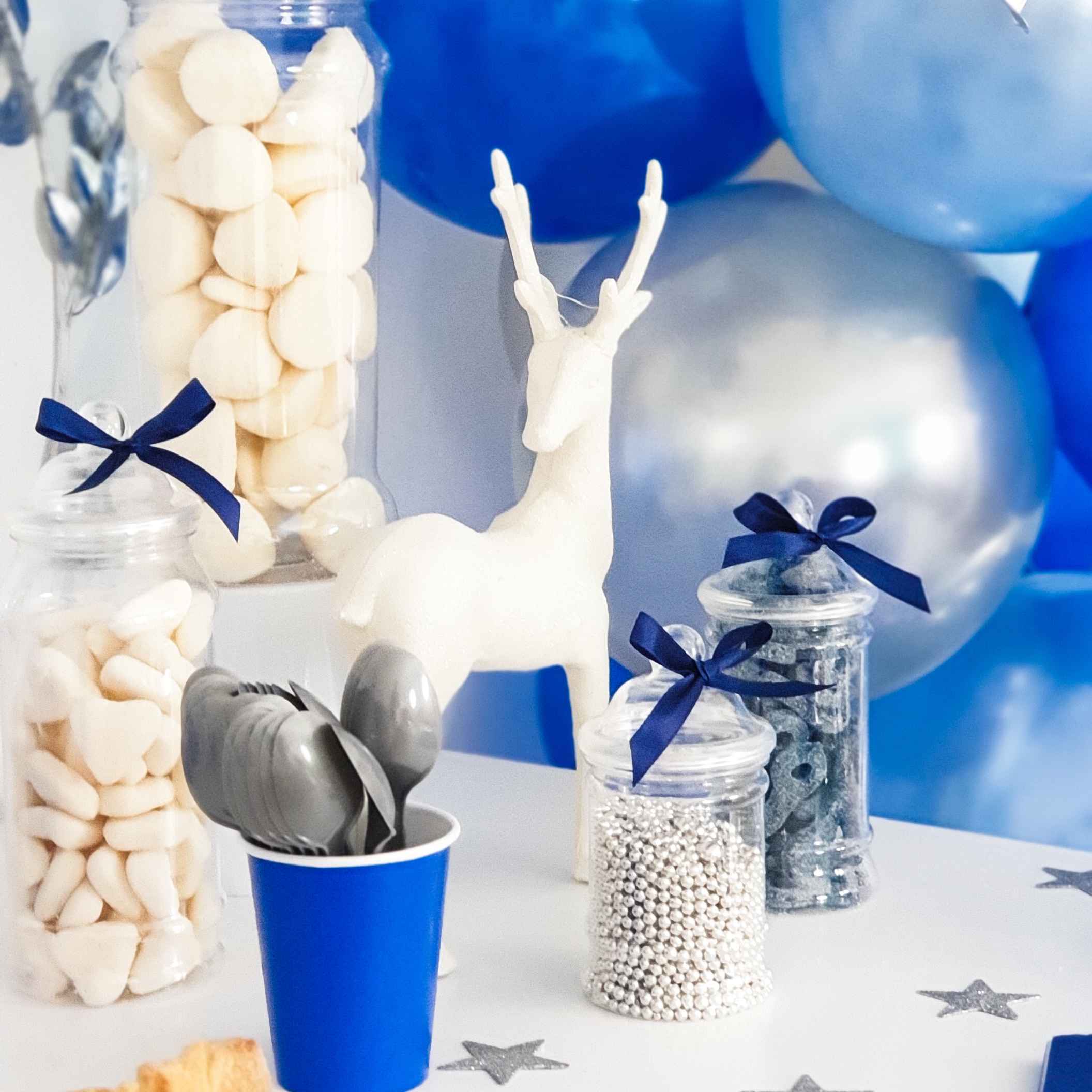 - Guirlandes et Luminaires: Des guirlandes lumineuses argentées et des luminaires bleus diffusent une ambiance féérique. Vous pouvez également utiliser des guirlandes de perles bleues et argentées pour habiller vos fenêtres et vos murs.